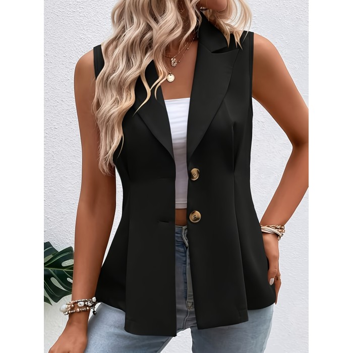 Solid Single Breasted Lapel Pleated Vest, Elegant Sleeveless Outwear For Spring & Fall, Women's Clothing