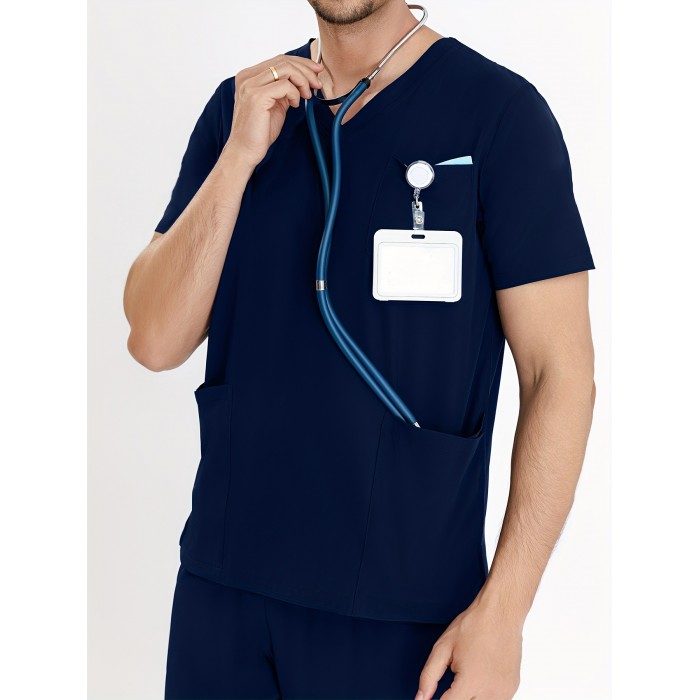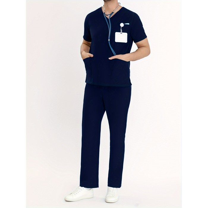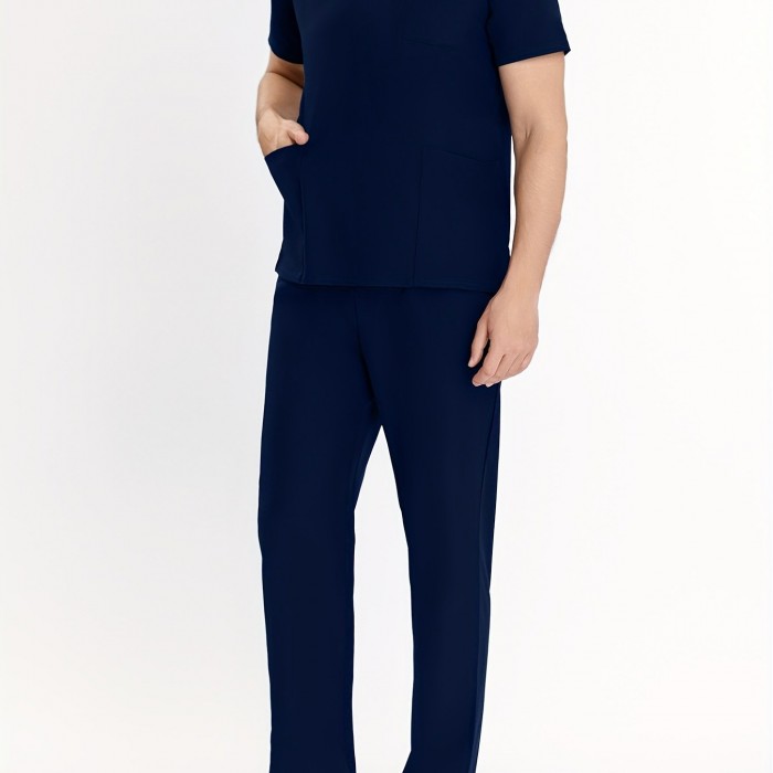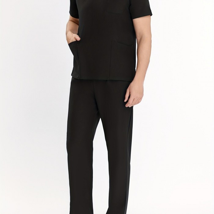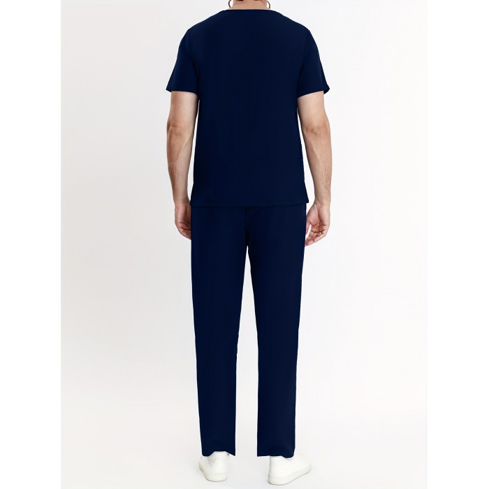 Men's 2-piece Workwear Set, Short Sleeve V Neck Shirt With Pocket Design & Pants Set, Men's Uniform